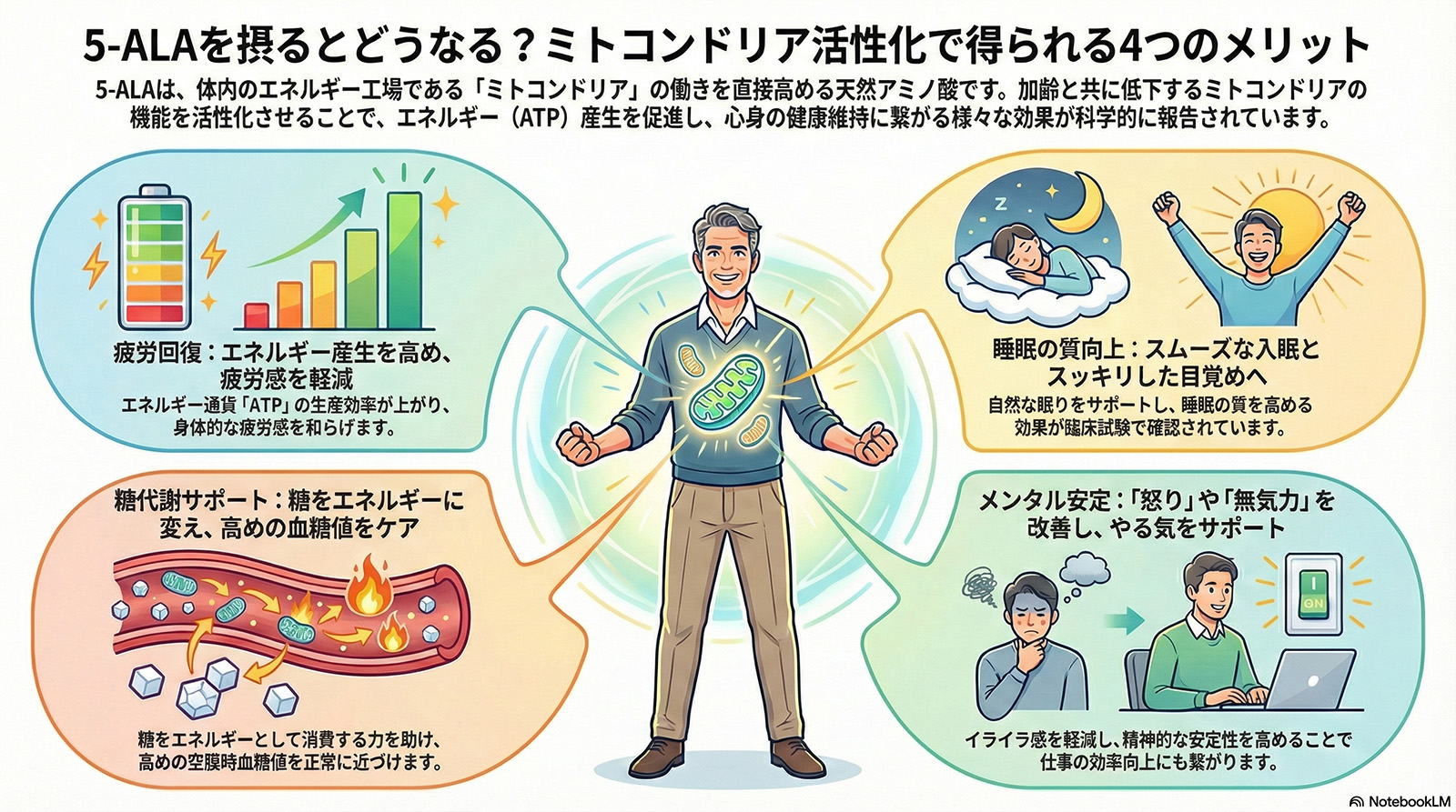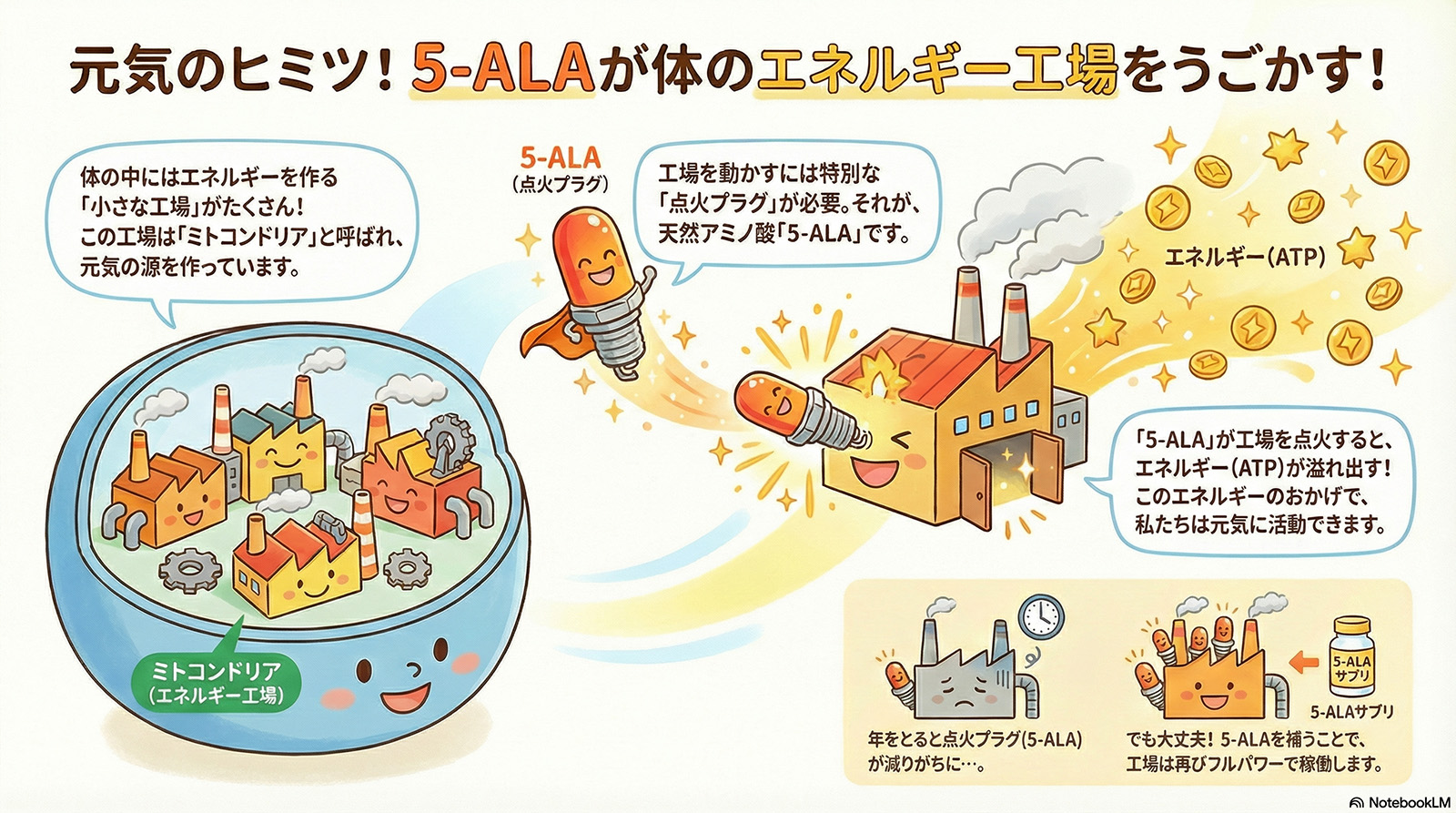 40代、50代になり、「寝ても疲れが取れない」「なんとなくやる気が出ない」と感じていませんか?それは単なる老化ではなく、細胞内のエネルギー工場である「ミトコンドリア」の点火プラグが不足しているからかもしれません。今回は、QOL(生活の質)を爆上げする注目のアミノ酸「5-ALA(ファイブ・アラ)」について、ひと目で分かる図解で解説します。