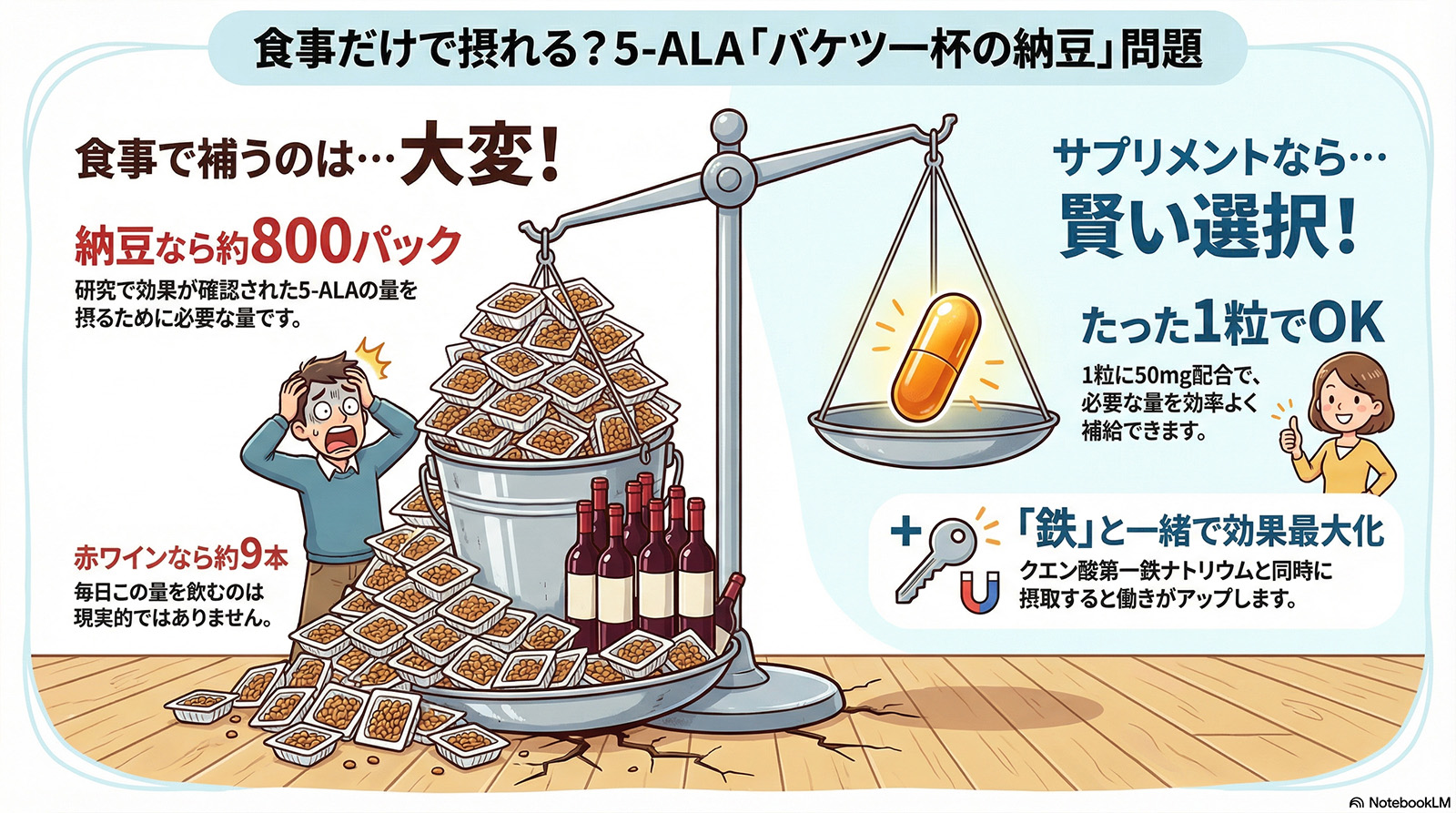 5-ALAは、納豆や黒酢などの発酵食品に含まれていますが、その量はごく微量です。例えば、研究で効果が確認されている量(数十mg)を食事だけで摂ろうとすると、納豆なら約800パック、ワインなら約9本も必要になってしまいます。 現実的には、食事(腸活としての納豆など)をベースにしつつ、サプリメントで効率よく補うのが賢い選択です。