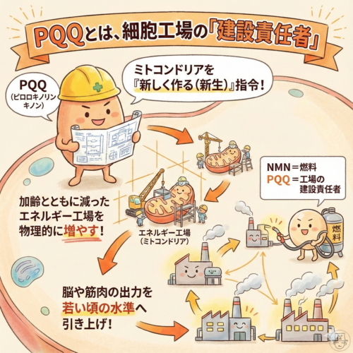 NMNが「燃料」なら、PQQは「工場の建設責任者」です。