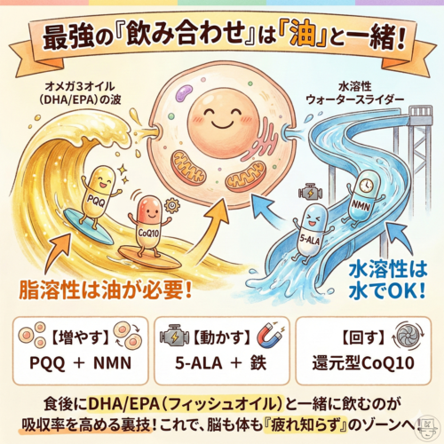PQQとCoQ10は「油」と相性が良いため、食後にDHA/EPA(フィッシュオイル)と一緒に飲むのが吸収率を高める裏技です。これで、脳も体も「疲れ知らず」のゾーンへ!