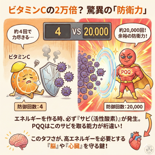 ビタミンCが約4回働くと力を失うのに対し、PQQは約20,000回も繰り返しサビを取り続けることができるという!