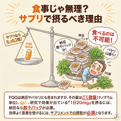 PQQは納豆やパセリ、母乳などにも含まれますが、その量はごく微量(ナノグラム単位)です。