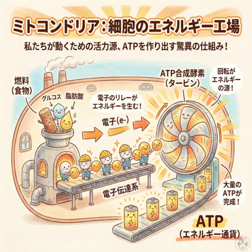 その仕組みは、まるで精巧な発電所のようです。食事から得た栄養と、呼吸で取り込んだ酸素を使い、ミトコンドリアの内側の膜で「電子」をバケツリレーのように受け渡します。