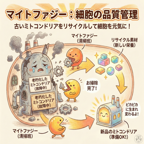 2016年にノーベル賞を受賞した大隅良典教授の研究で有名な「オートファジー(自食作用)」の一種で、損傷したミトコンドリアだけを専用の膜で包み込み、分解して再利用する「マイトファジー」という品質管理システムです。