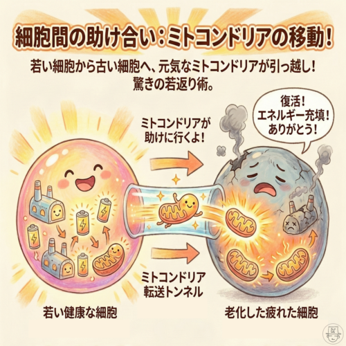 例えば肌の奥深くにある細胞(線維芽細胞)が老化すると、シワやたるみの原因になりますが、元気な細胞からトンネル(ナノチューブ)を通って新鮮なミトコンドリアが送り込まれると、老化した細胞が劇的に若返ることが確認されています。